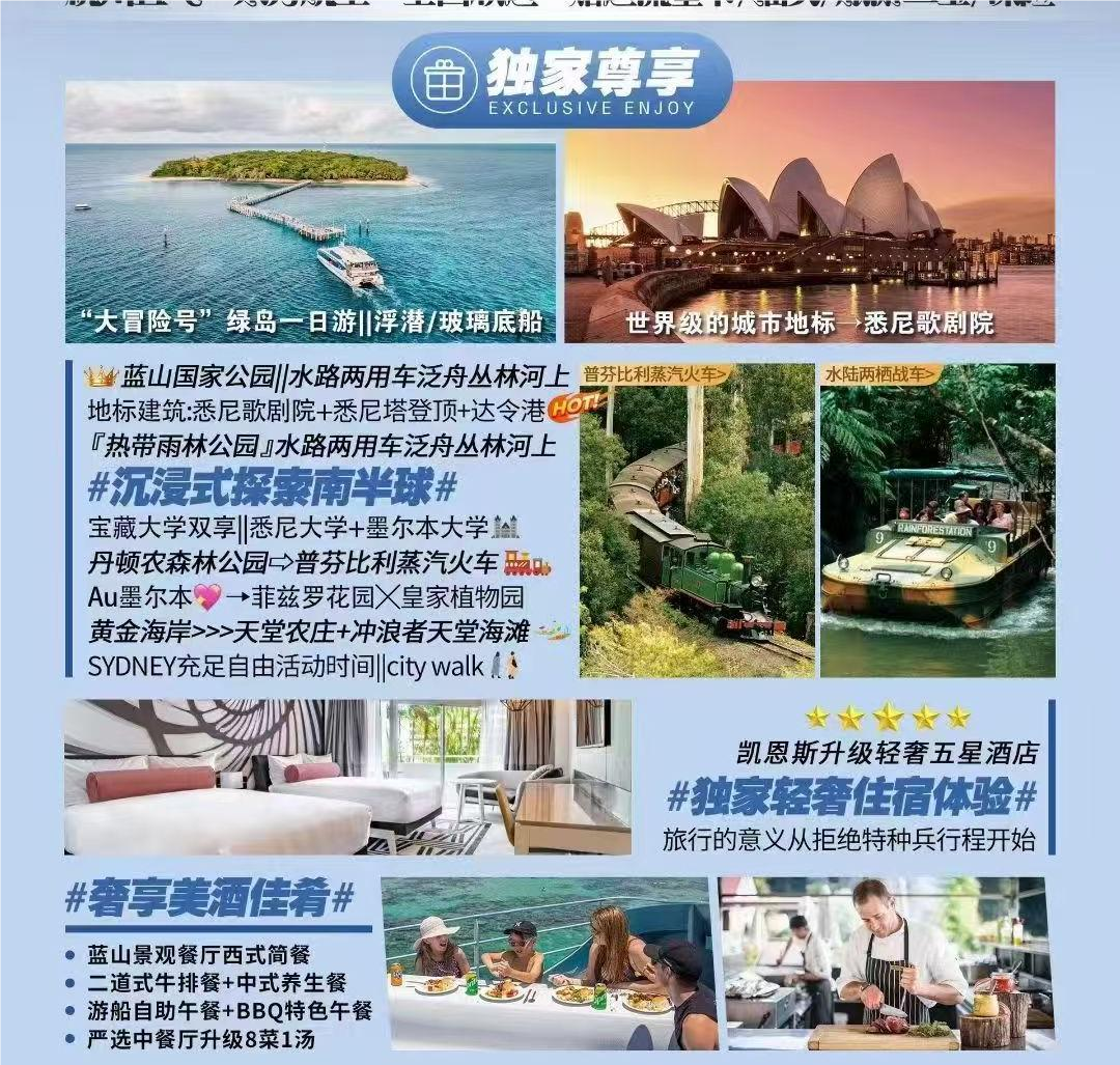 4.  夏令時(shí):悉尼、墨爾本當(dāng)?shù)貢r(shí)間比北京時(shí)間快3小時(shí),黃金海岸、凱恩斯當(dāng)?shù)貢r(shí)間比北京時(shí)間快2小時(shí),即當(dāng)北京時(shí)間為上午07:00時(shí),悉尼、墨爾本當(dāng)?shù)貢r(shí)間為上午10:00,以此類推。行程中所列航班時(shí)間均以出發(fā)當(dāng)?shù)丶暗诌_(dá)當(dāng)?shù)貢r(shí)間為準(zhǔn),請抵達(dá)后校準(zhǔn)時(shí)間。
